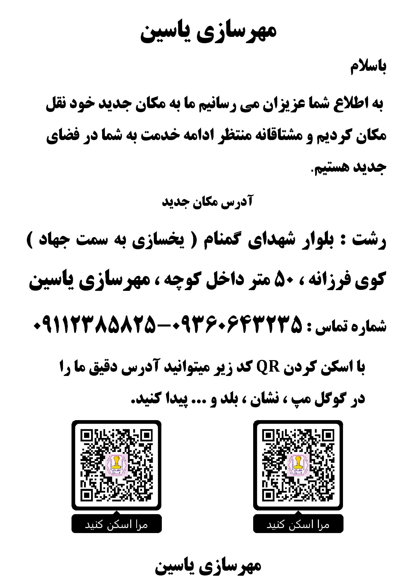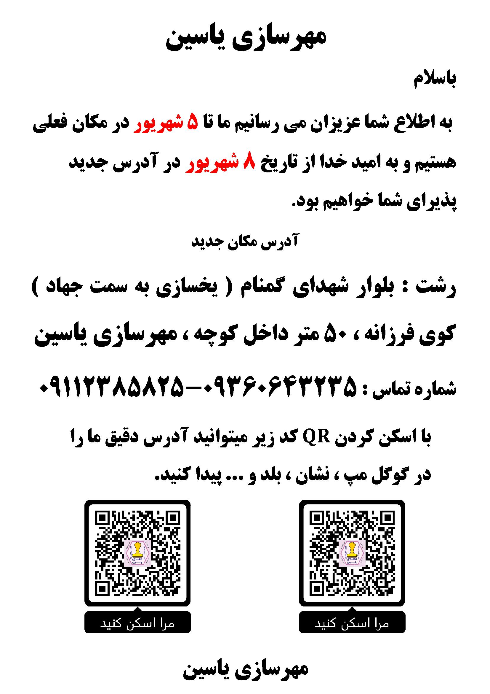آدرس: گیلان - رشت : بلوار شهدای گمنام ( یخسازی به سمت جهاد ) کوی فرزانه ، 50 متر داخل کوچه